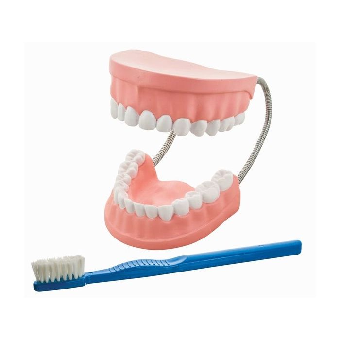 An enlarged dental model to demonstrate dental care or types of teeth, to students or children. Includes large tooth brush. The top and bottom of the model is connected by metal flex tube. The model is approx.10cm tall when jaw is closed. Made from hand painted and highly durable plastic. Comes with booklet guide on dental care in English and French.