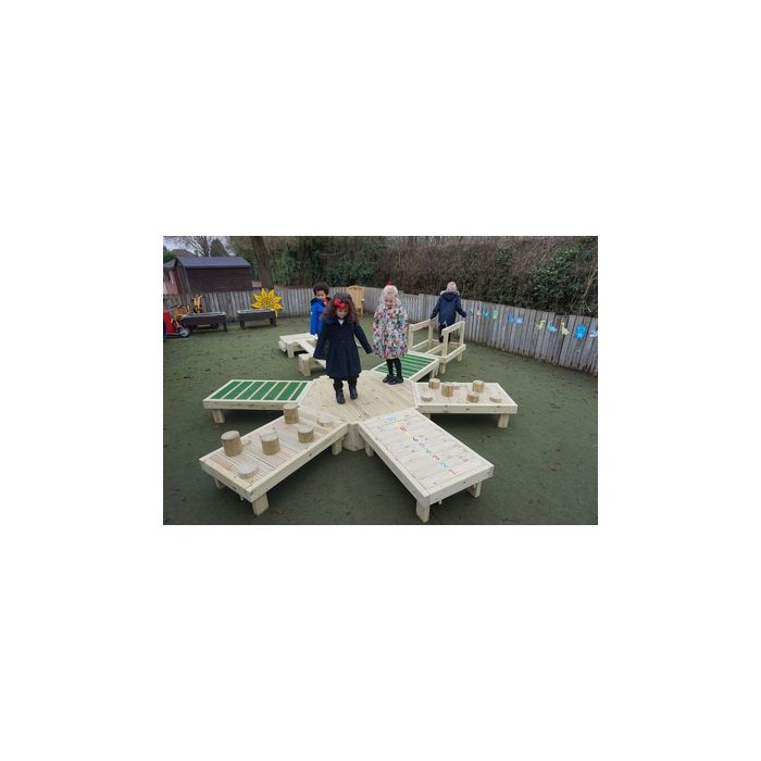 This is a fabulous addition to any learning environment enabling children to learn and develop from an early stage whist having fun and being active. Developed in line with the EYFS framework this item incorporates many of the seven areas of learning. This is ideal for open ended learning. In addition to the central hub, you receive the number steps, Balance Beam and Stepping Stones, Sensory Grass Walk, Narrow Balance and Ramp and Mini Stage.