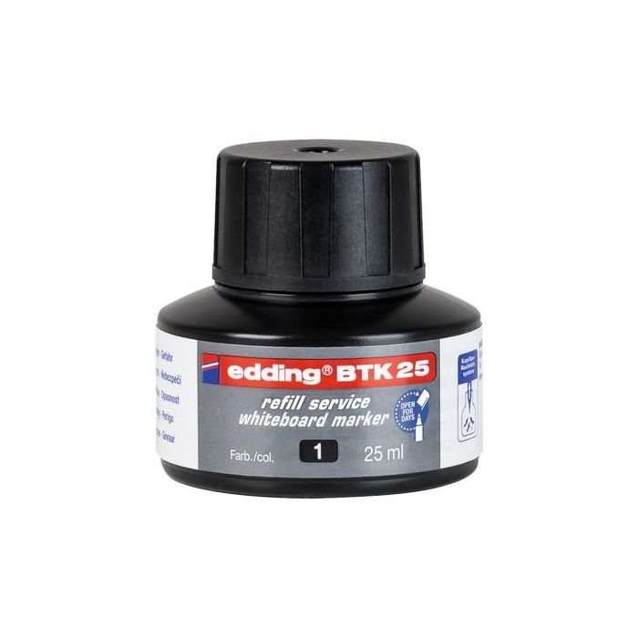 Refill ink with capillary system ideal for clean and straightforward refilling of almost all edding whiteboard markers. The refill bottle has a volume of 25ml. Simply stand the marker nib downwards in the refill bottle for at least an hour, or ideally overnight and the marker is then ready for use once again. With no added butyl acetate. Suitable for edding 360, 361, 363 and Ecoline 28 markers. Black. Each.