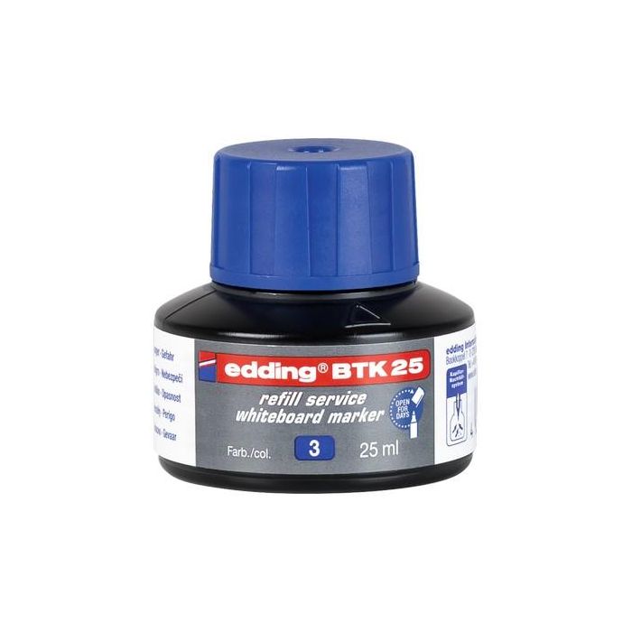 Refill ink with capillary system ideal for clean and straightforward refilling of almost all edding whiteboard markers. The refill bottle has a volume of 25ml. Simply stand the marker nib downwards in the refill bottle for at least an hour, or ideally overnight and the marker is then ready for use once again. With no added butyl acetate. Suitable for edding 360, 361, 363 and Ecoline 28 markers. Blue. Each.