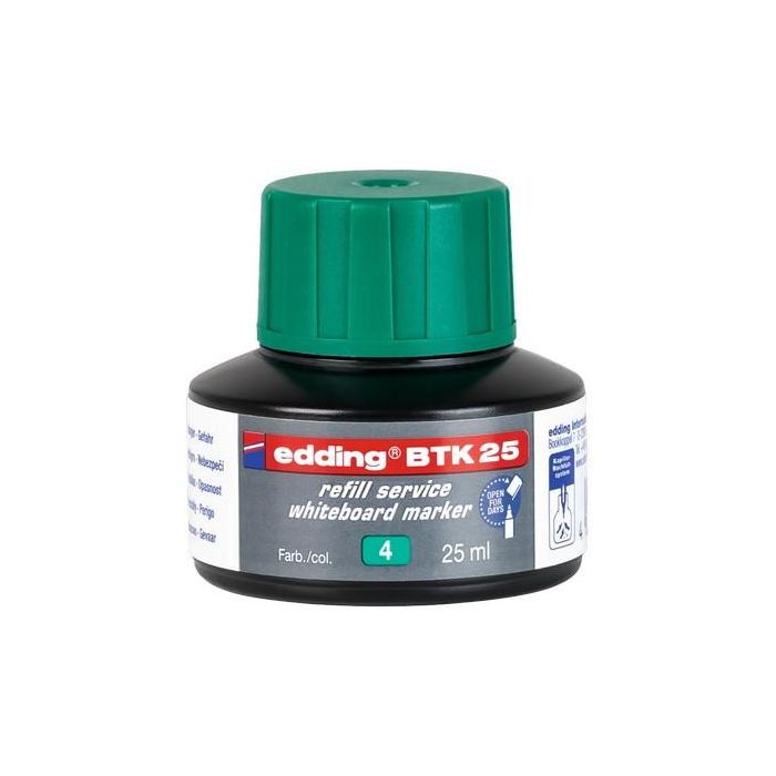 Refill ink with capillary system ideal for clean and straightforward refilling of almost all edding whiteboard markers. The refill bottle has a volume of 25ml. Simply stand the marker nib downwards in the refill bottle for at least an hour, or ideally overnight and the marker is then ready for use once again. With no added butyl acetate. Suitable for edding 360, 361, 363 and Ecoline 28 markers. Green. Each.