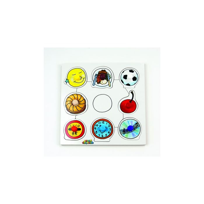 A set of four shape peg puzzles featuring everyday items found in our environment to represent the different shapes. Includes Circle, Rectangle, Square and Triangle. Eight pieces per puzzle. 200mm x 200mm.