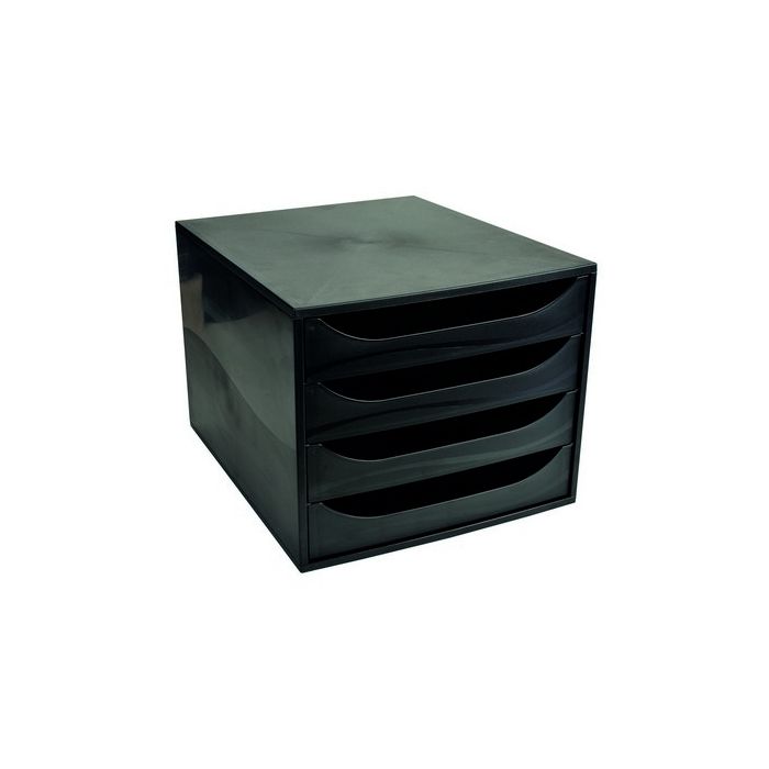 Exacompta ECOBOX Black Drawer Set includes 4 drawers designed for A4+ document storage. Blue Angel certified and made from recycled post-consumer plastics, the drawers allow easy access without opening, with smooth action and a built-in stop.