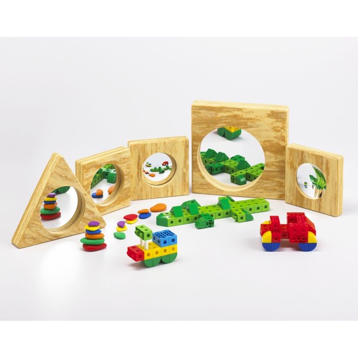 This set of 5 mirrors is a wonderful addition to your baby room or sensory offering. With a soft wood-effect EVA foam surround in a variety of shapes, the chunky mirrors can be stacked and will allow babies and children to explore light and reflection effects of the different mirrors. Includes 1 convex and 1 concave mirror.