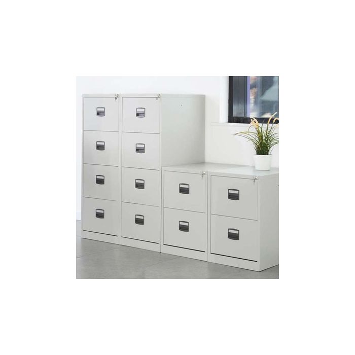 Filing cabinets offer a smooth, stylish and functional storage solution for every office environment. Strong and built to last, the filing cabinets have a fully welded carcass making them extremely robust, with resistance-free slides and an anti-tilt operation for safe ease of use. Economically priced with uncompromising standards, contract filing cabinets are designed and manufactured for today's modern office environment. Fully lockable 100% extension, anti-tilt drawers supplied with two keys. Functional office storage solutions for foolscap files with black, centralised handles. W458 x D620 x H1320mm