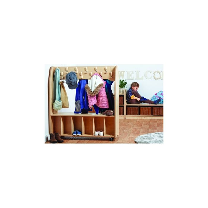 This Mobile Cloakroom Trolley is a flexible solution for your welcome area. The freestanding unit features 24 coat hooks (12 each side) plus bench and low level storage cubbies for personal belongings. Lockable castors are anti-scratch and low-noise and allow the trolley to be transported as required and then locked in position. Supplied fully assembled with a 10 year manufacturer's warranty. W1000 x D400 x H1100mm. Delivery of this product will be to kerbside only. You will need to arrange for the product to be moved to its final location.