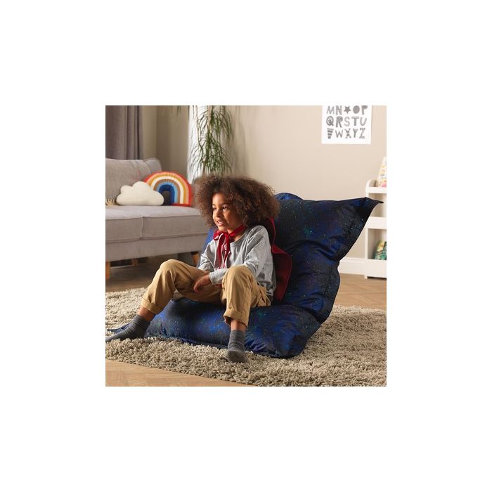 A large size for a variety of classrooms and students and can seat multiple children or be used independently. Can be positioned against a wall to offer back support. UV reflective galaxy print features a large number of stars and cool-coloured nebulas. Made from durable, waterproof wipeable clean fabric for easy maintenance. The zip features a concealed zip head cover pocket to help deter children accessing the zip. Complies to UK fire safety regulations BS5852 and has passed all relevant chemical tests. W100 x L125cm.