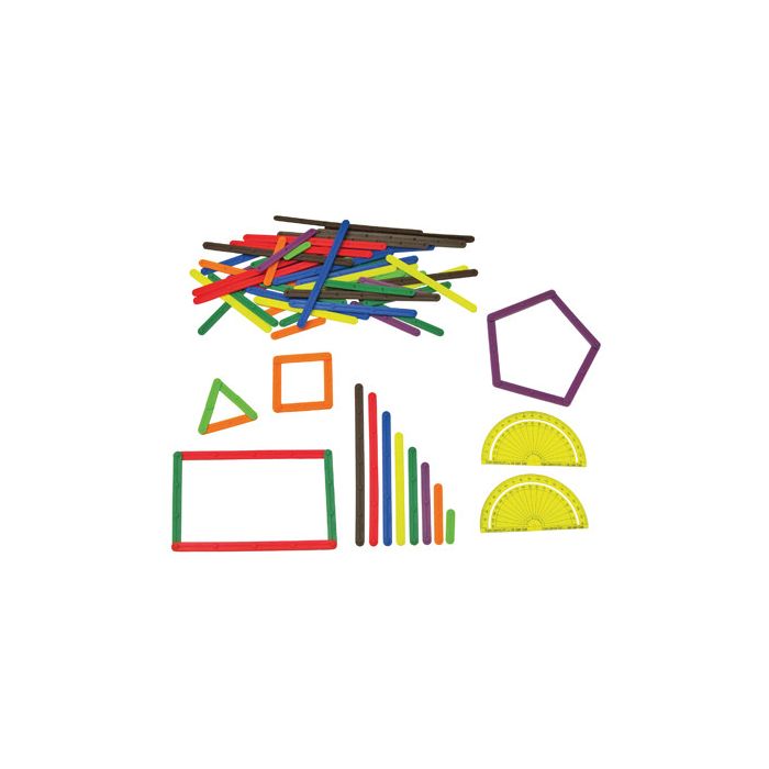 A set of 8 different length flexible sticks that snap together at different angles to allow students to explore plane geometry. Includes 80 flexible sticks and two 100mm protractors. Sizes range from 25mm to 150mm.
