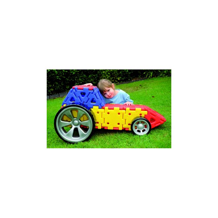 Children can create their own moving vehicles with this Giant Polydron Vehicle Builders Set. There are two different sized freely rotating wheels, which allow for an exiting variety of models. Children will learn how to grab, pull and push their models, which helps with their co-ordination and synchronises movement. The two different sized wheels allow for a variety of models such as a hot rod, tractor, bus or racing car. Made from 76% recycled plastic which is lightweight and durable. BPA Free. Comes complete with a picture guide. Set of 32 pieces. 4 Squares (210 x 210mm), 8 equilateral triangles, 16 gear squares, 2 small wheels and 2 big wheels. Hand was with mild sterilizing detergent. Suitable for Age 2+.