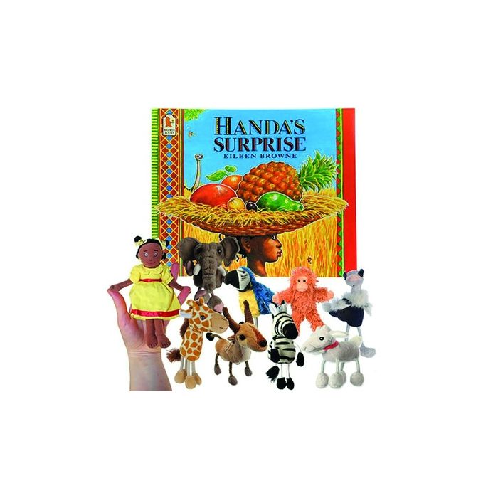 This popular story by Eileen Browne tells of Handa visiting her friend Akeyo with a basket of fruit as a surprise. Little does she know that lots of animals are very interested in the fruit as well. Includes the paperback book plus Girl, Monkey, Ostrich, Zebra, Elephant, Giraffe, Antelope, Parrot & Goat finger puppets.