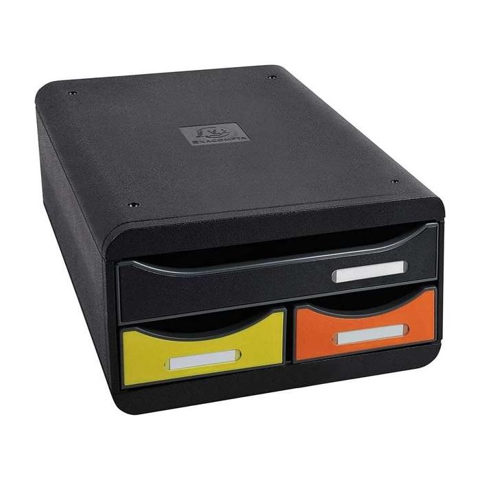 Exacompta Iderama SMALL-BOX MINI 3 desk drawer set in Iderama multi-coloured finish includes 3 drawers of 43mm height, with 1 drawer for storing A4+ documents and 2 narrow drawers for office essentials. With a compact 13.5cm height, it can be used as a screen, printer, or desktop sorter support. Stackable through 4 notches, the unit features smooth drawer action with stop and comes with label holders included.