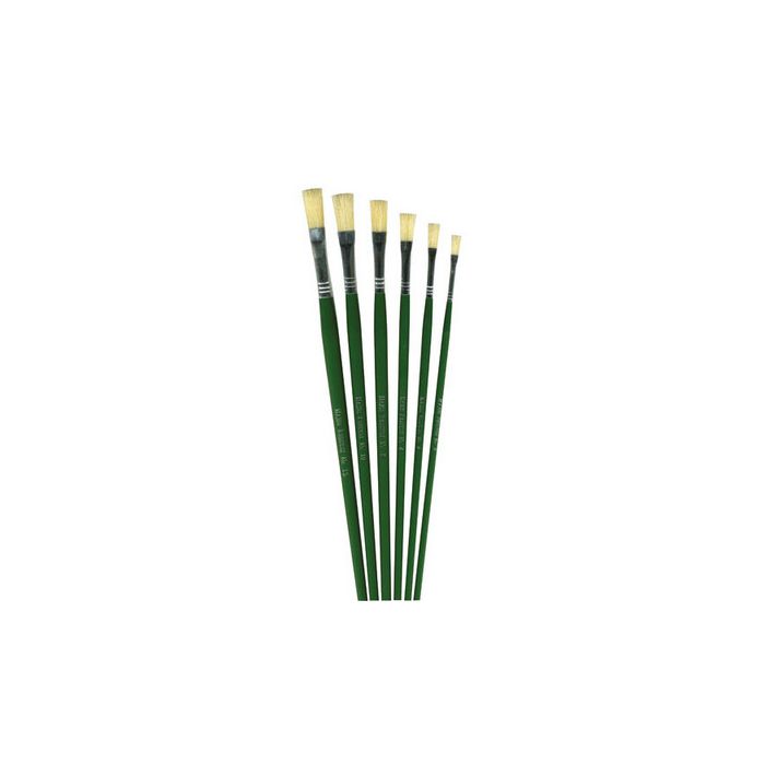 Set of 6 flat tip brushes with a long gloss green handle. Ideal for watercolours, acrylic and oil. Set contains one each of sizes 2, 4, 6, 8, 10 and 12. Approximate overall lengths 28cm – 31cm.