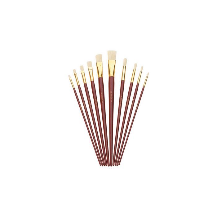 Ideal for versatile painting techniques, the Hog Bristle Long Handle Paint Brushes in a Brown finish are perfect for gouache, oil, acrylic, and poster paint. This pack of 10 includes a mix of flat sizes (2, 4, 6, 8, 10, 12) and round sizes (2, 4, 6, 8), offering precision and durability. Long, chunky handles provide comfort and control, making them an excellent choice for classroom or studio use. A practical and budget-friendly solution for art projects.