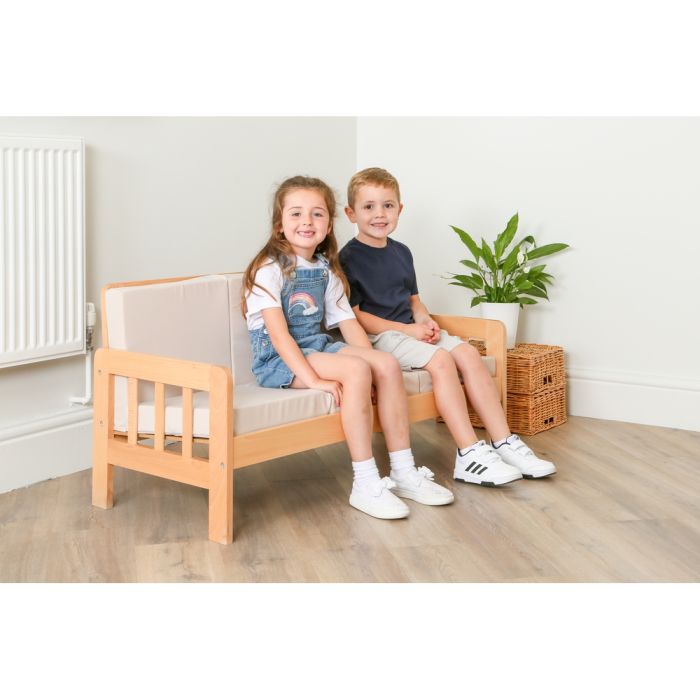 Ideal for any school reading corner or home play area. The cushions have flame retardant covers which may be removed for washing up to 60c. Made from the finest quality hard-wood is used throughout the frames which have a natural polish finish and robustly jointed for hard wear. Supplied flat packed for easy self assembly. H560 x W840 x D500mm.