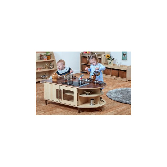 Charming and engaging, the Island Kitchen is perfect for encouraging collaborative play which helps to develop imagination, communication and language skills. The kitchen has a cooker hob, removable sink, oven, dishwasher, 2 x storage cupboards and 4 x corner storage shelves. There is also a breakfast bar at one end. Made from maple and walnut melamine. 450mm worktop height. Supplied fully assembled with a 5 year manufacturer's warranty. W1330 x D700 x H600mm. Delivery of this product will be to kerbside only. You will need to arrange for the product to be moved to its final location.