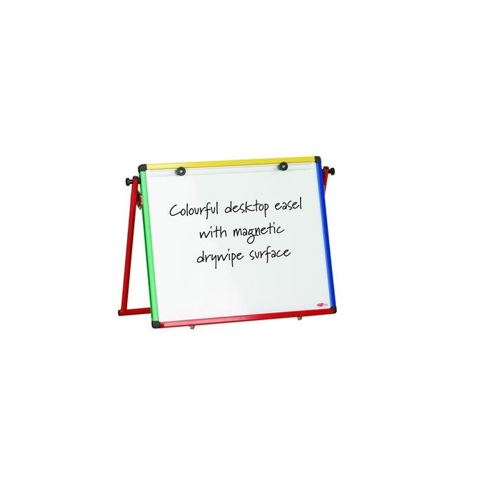 Ideal for small groups, as a painting easel or drawing board. Portable easel for desktop use. 500(H) x 600(W) drywipe whitebaord surface which also accepts magnets. Supplied with clamps for paper or flipchart pads. Available with anodised aluminium or multicoloured frame.