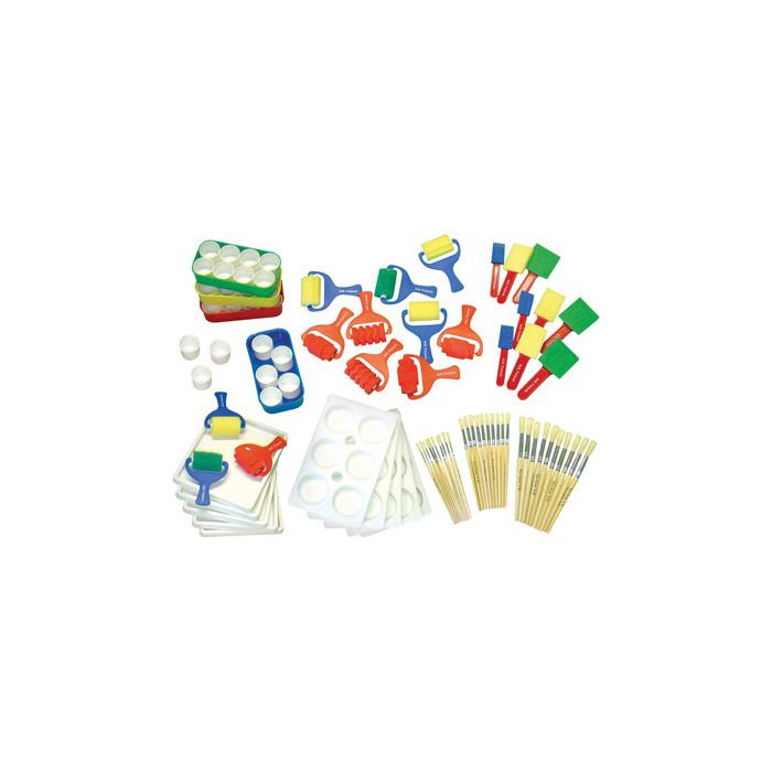 Includes: 30 x hog hair short round brushes - sizes 8, 12 and 18, 4 x paint pot trays with 8 pots each, 5 x economy 6 well palettes, 5 x inking trays, 2 x set of 6 patterned foam rollers, 1 x set of 9 foam brushes in 3 sizes, 35mm, 50mm and 65mm - Set - Age 3+