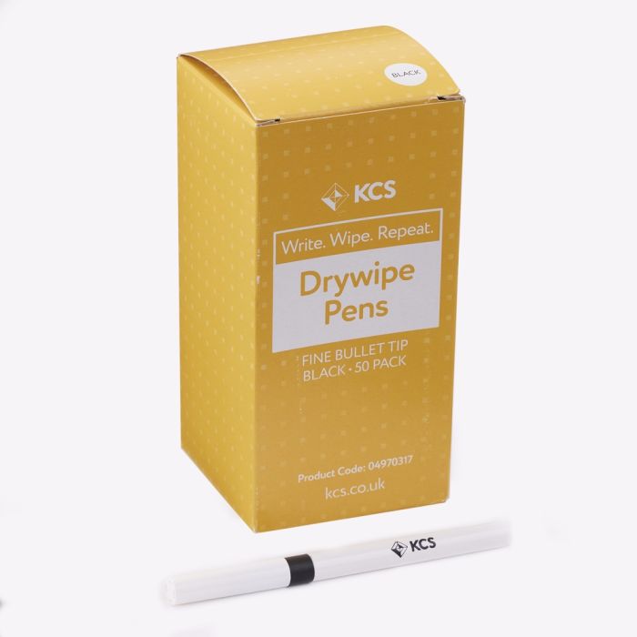 KCS Drywipe markers with a fine bullet tip. 185m writing length. 2 day cap-off. Xylene-free. Ventilated cap. Black. Pack of 200.