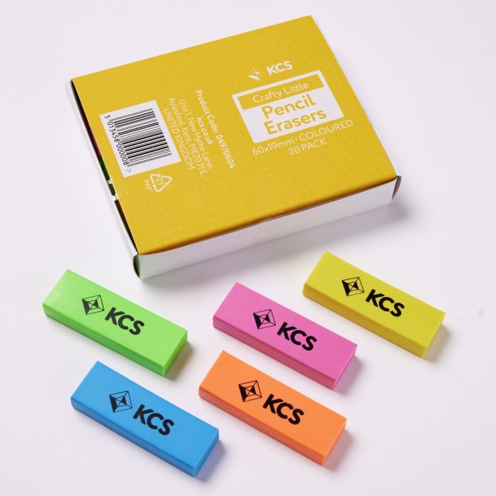 Great value assorted coloured erasers. Dimensions: 60 x 19mm. Pack 20.