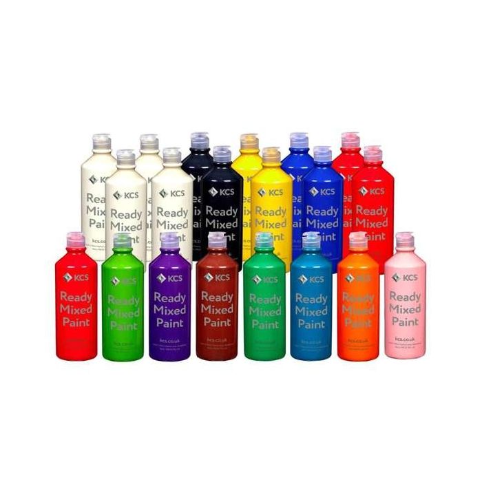 KCS water-based ready-mixed paint is the perfect choice for classrooms and school cupboards. Boasting vibrant colours and smooth application, it’s great for all ages and skill levels. Wheat, gluten and dairy free. Pack of 20 x 600ml bottles in an assortment of colours. Colours included: 4 x White, 2 x Black, 2 x Brilliant Blue, 2 x Brilliant Red, 2 x Brilliant Yellow, 1 x Turquoise, 1 x Purple, 1 x Burnt Umber, 1 x Crimson, 1 x Orange, 1 x Leaf Green, 1 x Sky Blue