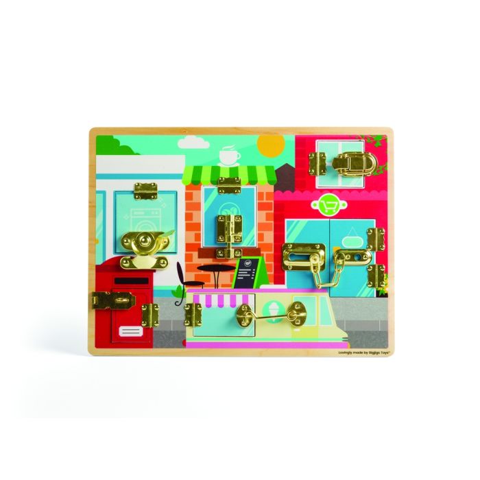 This Montessori-style board will help children develop their motor skills, hand-eye coordination and dexterity as they learn to manipulate the different fixtures that include: a toggle catch, bolt, hinges, chain slide lock, padlock hasp, turn latch, and hook & eye latch. As children learn to open the doors, they will find detailed scenes underneath that will ignite their imaginations! Age 2 years+