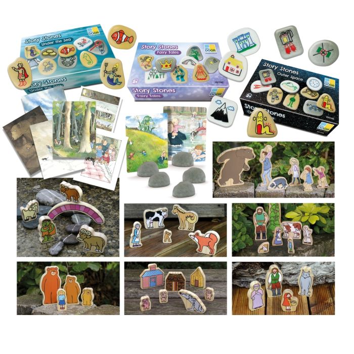 Includes: 1 x Fairy Tales Story Stones, 1 x Outer Space Story Stones, 1 x Under the Sea Story Stones, 1 x the Billy Goats Gruff characters, 1 x The Three Little Pigs characters, 1 x Goldilocks Characters, 1 x Little Red Riding Hood characters, 1 x Jack and the Beanstalk characters, 1 x The Gingerbread Man characters, 1 x We're Going on a Bear Hunt wooden character set, 1 x We're Going on a Bear Hunt Story Talk Cards and 1 x Sand-it-Stones.