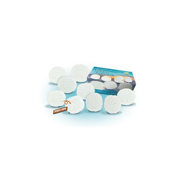 This set of 8 polar animal footprint stones will encourage children to learn all about the animals that inhabit these icy landscapes and develop the vocabulary and knowledge about these habitats. The set features animals from the Arctic and Antarctica, including: polar bear, reindeer, wolf, musk ox, arctic fox, arctic hare, albatross and penguin. Each stone features a raised footprint on one side and its animal owner on the other, and as children play with them in sand, clay, dough or snow, they can experiment with different amounts of force and pressure to create impressions and build their own footprint trail and animal stories. These stones, made from a stone and resin mix, are durable and hard wearing, making them ideal for indoor or outdoor play. Set of 8. Size 70 - 80mm. Age 2 years+