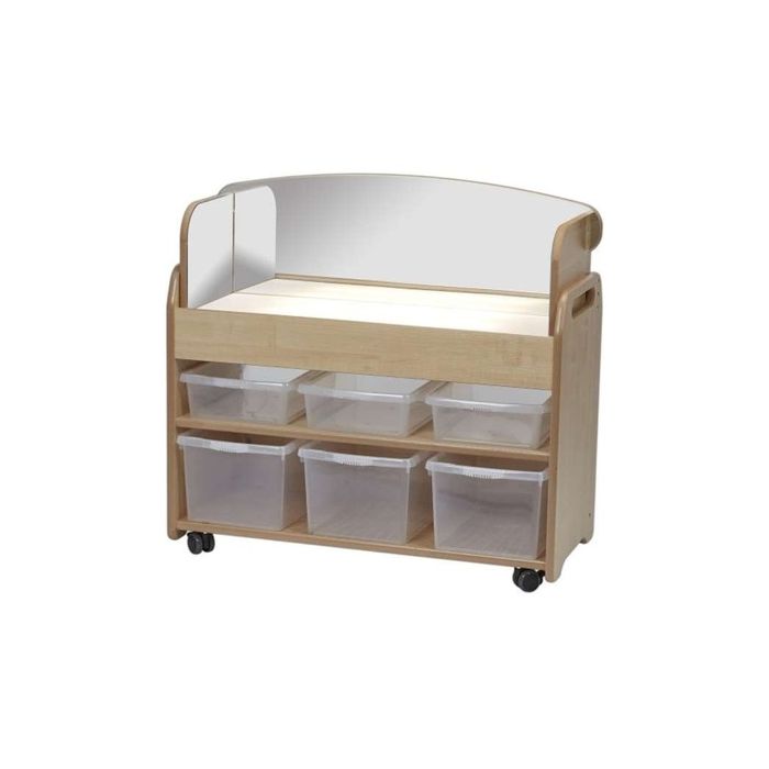 This mirror surround and light box combination helps to create a focused space for sensory development and play. The mirror is easy to remove as required to accommodate group play. Complete with 3 x shallow clear tubs and 3 x deep clear tubs for housing resources. The light box is mains operated with LED bulbs which can be replaced as required. W900 x D400 x H870mm. Delivery of this product will be to kerbside only. You will need to arrange for the product to be moved to its final location.