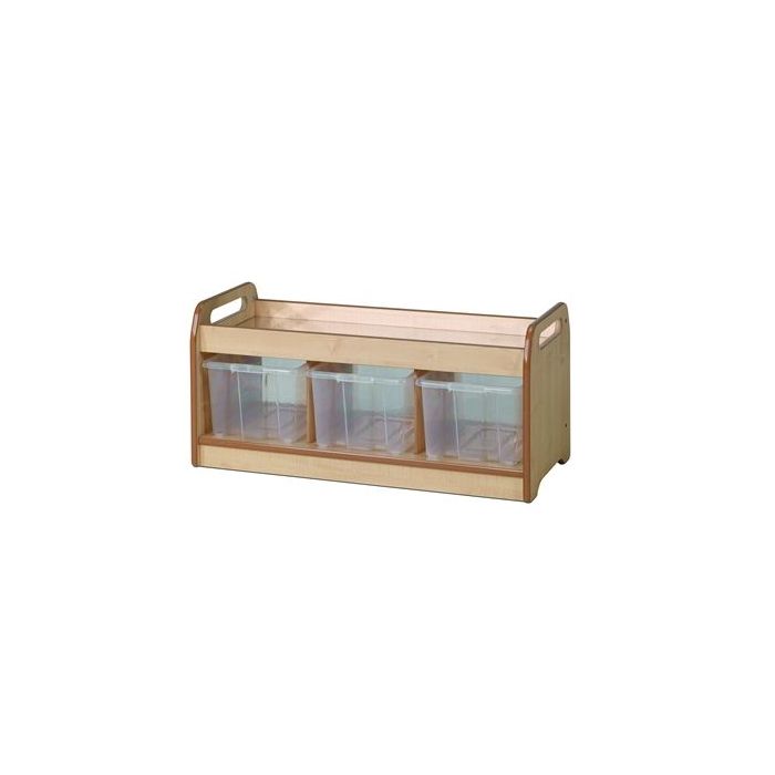 Low level and easy access unit with mirror surface for sensory play. Manufactured in the UK from premium grade maple melamine. Removable safety mirror surface. Includes 3 clear tubs or 3 baskets. Supplied fully assembled with a 10 year manufacturer's warranty. W900 x D400 x H430mm - Top shelf: H320mm. Delivery of this product will be to kerbside only. You will need to arrange for the product to be moved to its final location.