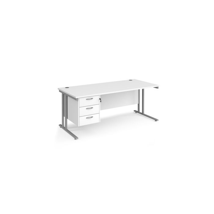 A staple for the modern office, the Maestro 25 desking range, with its minimal, modern styling and multiple colour options is there when you need it, but doesn’t demand constant attention. The welded double upright cantilever leg frame structure is powder coated for a stylish under frame and when combined with a 25mm melamine desktop ensures the strength and stability needed in commercial office furniture. Durable 25mm melamine worktops with 18mm back modesty panels. Pedestal has three shallow drawers with silver handles. Three drawer fixed pedestal which can be fitted to left or right hand side. Single cable access port.H725 x D800mm.