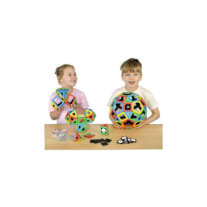 The shapes in this set offer a wealth of possibilities, making learning fun whilst developing key skills. The shapes easily snap together allowing children to learn about polarity which introduces magnetism through hands-on play. Mathematical concepts can also be explored as children create 2D and 3D shapes such as cubes and pyramids. The panels will challenge the creative instincts of children as well as allowing them to easily construct recognisable geometric shapes. Pack of 184 pieces. Includes 36 squares (60 x 60mm), 60 equilateral triangles, 24 right angle triangles, 12 rectangles, 12 pentagons, 20 mirror panels, 20 write on/off panels and an ideas poster. Made from 70% recycled plastic. BPA Free. Supplied in a reusable, recyclable carton. Sterilize with alcohol based sanitiser. Suitable for Age 3+.