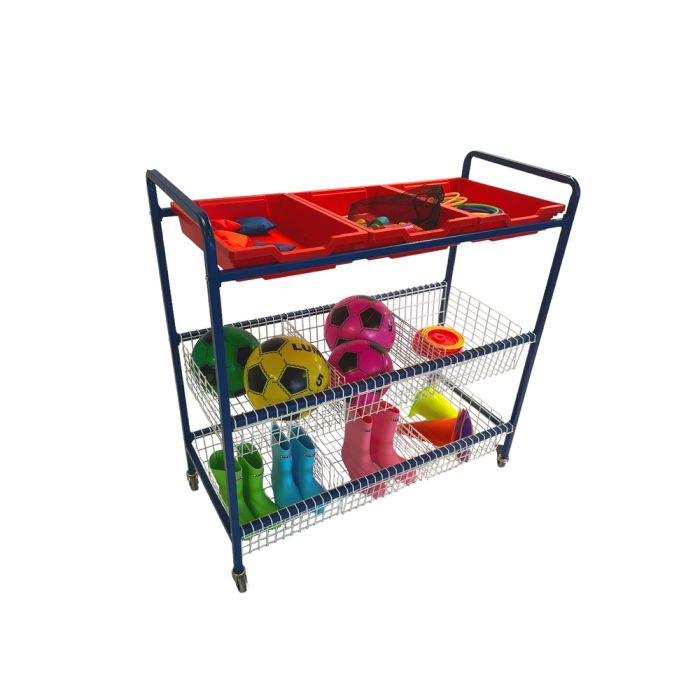 This mobile sand and water trolley is the perfect solution for storing your sand and water resources. The frame is made from a sturdy steel frame and comes with 6 removable wired baskets and 3 shallow plastic trays. Supplied with lockable castors and flat-packed for easy assembly. H1250 x L1100 x W445mm.