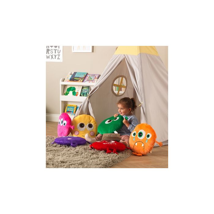 Cushions come in eight bright colours and feature a different emotional expression on one side. Supports emotional development by helping children to manage and explore feelings and behaviour. Encourages group dicussions and debate in any language. Embroidered applique design provides an extra sensory feature and are perfect for non-verbal children. Fully machine washable. suitable for under 3's. W34 x H34cm.