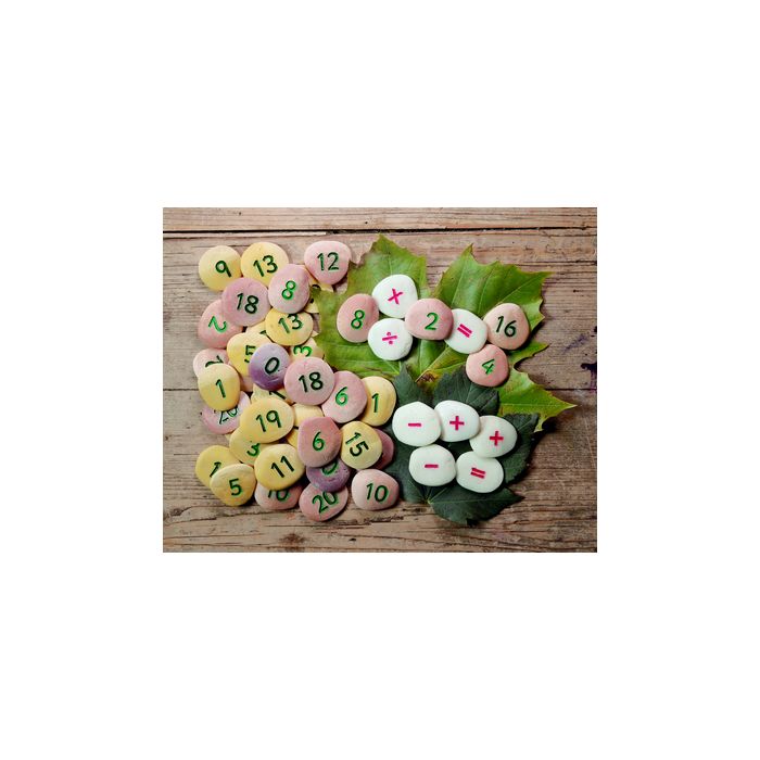 These tactile pebbles can be used in sand, water and small world play. Cast from a unique mix including real stone, each pebble is engraved with a number and measures between 30-45mm. Includes: 2 of number 0-20, plus, minus, equals and one each of multiply and divide. Age 2+