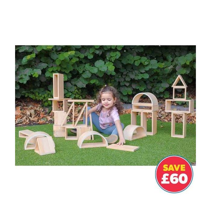 Variety of shapes including cubes, cuboids, prisms, arches and planks. Made from pine and birch plywood with laquered finish. Store indoors when not in use. Set of 30 pieces. Largest cuboid measures 120 x 240 x 120mm. Age 3 years+