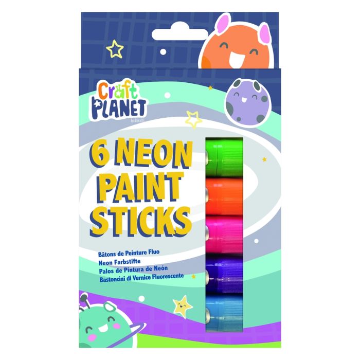Water soluble, child friendly solid paint sticks that twist up and down just like a glue stick. Includes assorted neon colours. Suitable for multiple surfaces and easy to clean off glass and plastic. Quick drying and portable. 6 pack