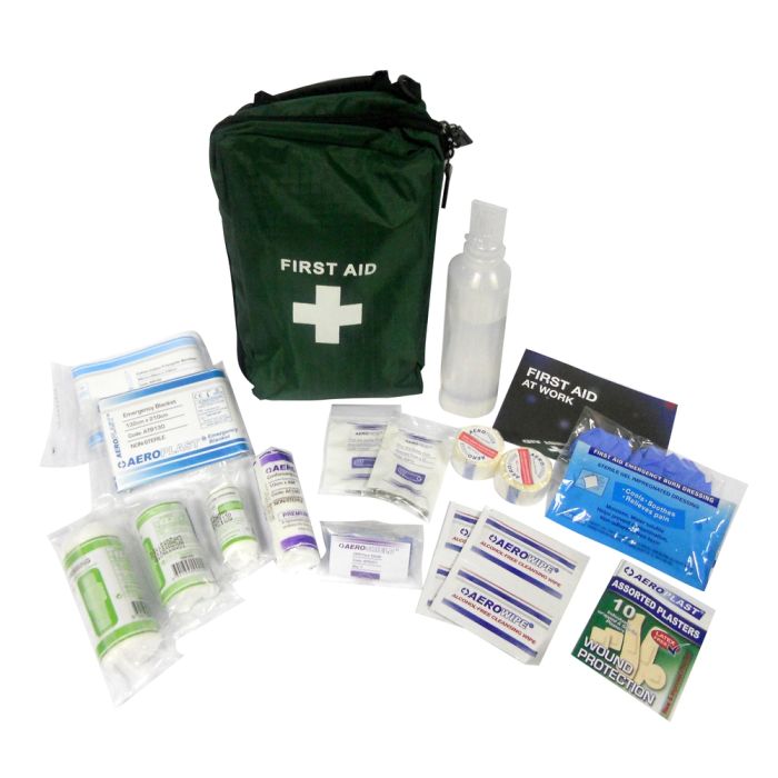 Contains 1 triangular bandage, 1 large dressing, 1 foil blanket, 2 pairs disposable gloves, 1 guidance leaflet, 10 assorted plasters, 1 resuscitation face shield, 1 pair shears, 4 cleansing wipes in vinyl wallet. BS8599-1:2019 compliant.