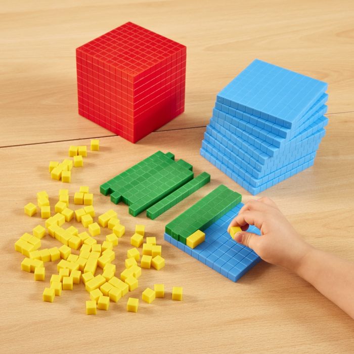 Visualise numbers easily with the Place Value Base Ten Classroom Set. Ideal for teaching addition, subtraction, multiplication, and division, this set includes 100 yellow cubes, 10 green rods, 10 blue flats, and a red thousand block. Durable and marked in centimetres for clear unit relations. Perfect for both individual and group activities. Enhance learning with this essential resource.