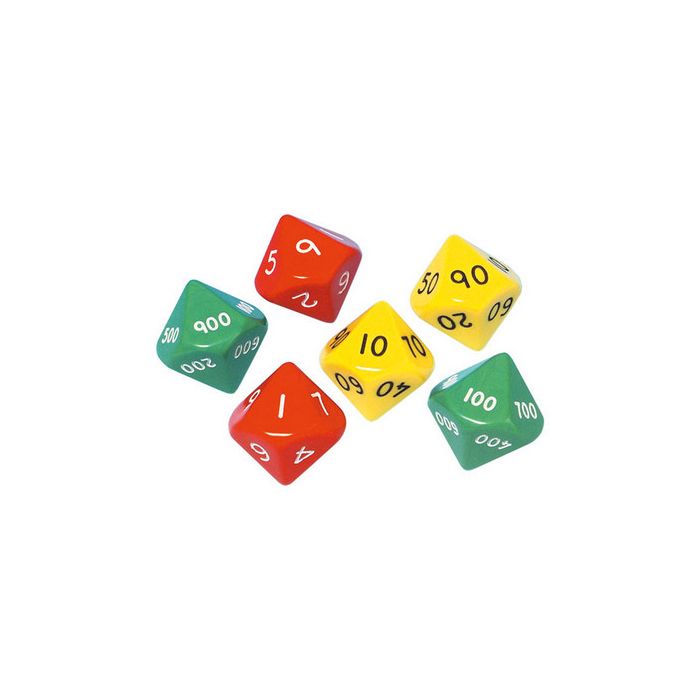 Place Value Dice with Hundreds, Tens and Units Pack of 6. 10 sided dice for exploring, number and place value. Great for place value, random number generation, involvement and many numeracy activities.