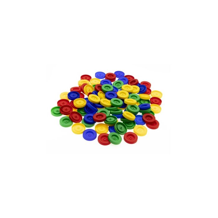 Bulk bag of plastic wheel with a 40mm diameter in various bright colours. Pack 100