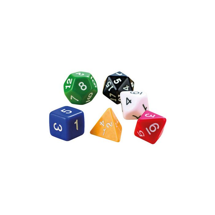 Polyhedral assorted number dice in a pack 6, ranging from number 1 to 4 and all the way up to 20. This assorted set of six number cice, showing number ranges 1-4, 1-6, 1-8, 1-10, 1-12 and 1-20.