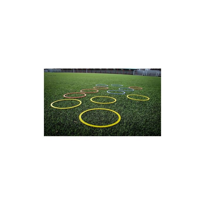 16" hoops. Set of 12 - 4 red, 4 yellow, 4 blue. Designed to improve speed, footwork and co-ordination. Supplied with a bag.