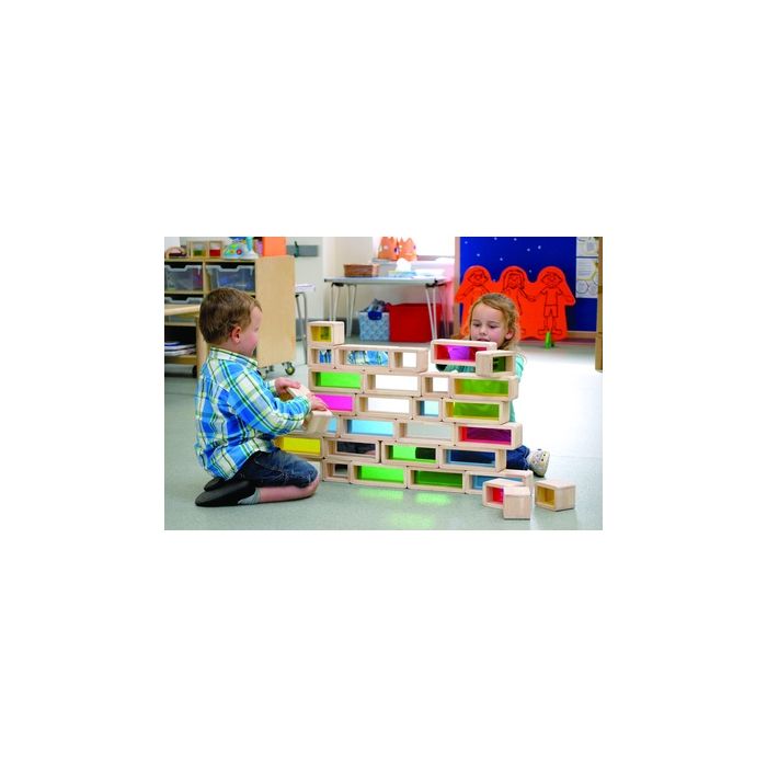Giant visually stunning building bricks made from beautiful rubberwood with colourful transparent acrylic inserts. Can be used in building and stacking with double and half sized bricks. The set includes 36 pieces (24 large, 12 small) with rounded corners and colourful inserts (red, green, blue, yellow, clear and mirror). Children will hold them up to their eyes to see a world in different colours. Can also be used for colour mixing and on a light box. Size of large brick: 200 x 75 x 75mm. Size of small brick: 100 x 75 x 75mm. Suitable from 12 months.