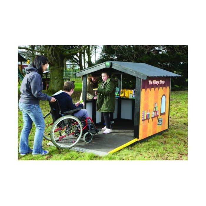 The SEN Recycled Plastic Village Shop is ideal for schools and playgrounds in creating an inclusive space. Encourages children to role play, interact with friends, and encourages imaginative play. The SEN Village Shop comes with a ramp for wheelchair accessibility to promote inclusive play and has wrap around graphics depicting a shop environment. Green Apple Award winning. Made from 100% HDPE recycled plastic. Maintenance free. Recyclable at the end of its life. Delivers high strength, is non-staining and long lasting.