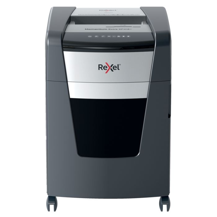 The XP418+ shredder machine shreds up to 18 sheets of A4 paper (80gsm) in one go through the manual feed slot into P-4 (4x35mm) cross cut pieces. Active sensing technology measures the number of sheets being fed in real-time to stop paper jams and misfeeds; indicated by a red LED on the control panel. This paper shredder will not operate until the number of sheets is reduced below or at the maximum sheet capacity. This cross cut shredder is designed for moderate to heavy use with its high sheet capacity, large 45L bin size and continuous run time. There's no need to remove staples and paper clips first; this Rexel shredder also safely shreds CD's, DVD's and credit cards through a separate feed slot.