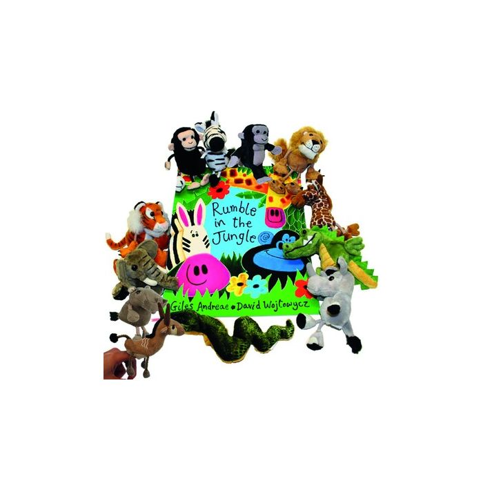 By Giles Andreae & David Wojtowycz.There's a rumble in the jungle, there's a whisper in the trees, the animals are waking up and rustling the leaves. Chimp, Giraffe, Zebra, Antelope, Lion, Tiger, Rhino, Snake, Elephant, Crocodile, Gorilla & Hippo finger puppets included to help bring this popular story to life. Please note, Leopard finger puppet not included