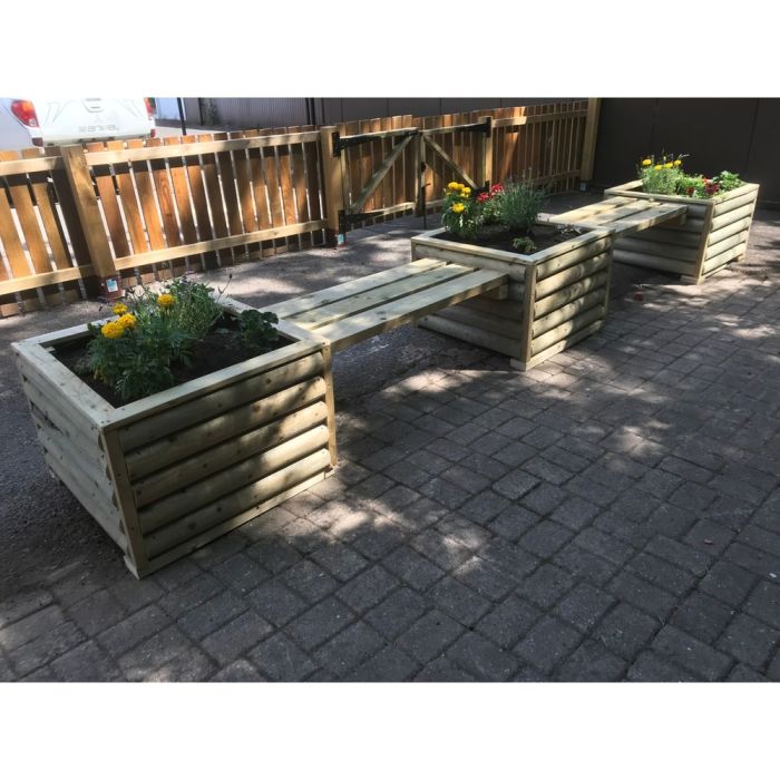 This rustic planter and bench features two planters adjoined by a bench, offering a charming and multifunctional environment for individuals to connect with the outdoors and enjoy moments of tranquillity. The thoughtful design encourages the enjoyment of nature, creating a serene and inviting space for relaxation, gardening, and outdoor leisure. The Rustic Log Lap Planter and Bench provides a delightful and functional setting for individuals to cultivate and appreciate the beauty of the natural world, creating a harmonious and enriching environment in outdoor spaces. L2400 x D800 x H600mm.
