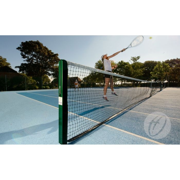 76mm square tennis posts manufactured from 76mm x 3.2mm steel that are powder coated green with heavy-duty brass winder and brass pulley wheel. They have a stainless steel net retaining bar, 359mm deep sockets with a 79mm sq internal face and flush fitting hinged lids. Weight: 33kg per pair