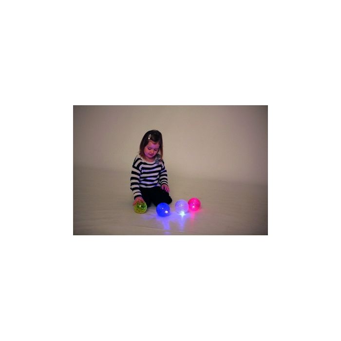 Children will love to play with these balls that light up and flash when bounced. The textured round balls each have different surface textures, Approximately 1200 flashing cycles. Large texture. Size 100mm dia. Set of 4. Age 12 months+