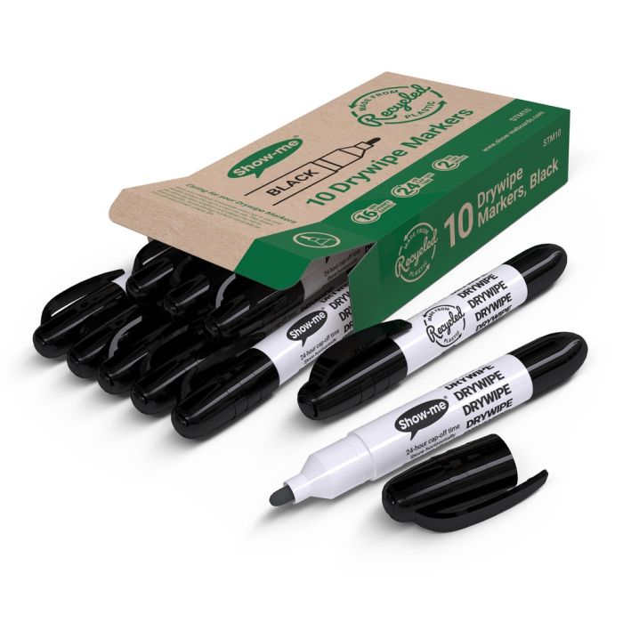 Show-me® Eco drywipe markers are ideal for use in any environment including the classroom and office. Full sized drywipe pen with an extra hard bullet tip nib to keep its shape for longer. A sustainable choice, with the barrel, end cap and lid being made from 100% recycled and recyclable plastic. A great option if you're trying to choose a product that has a more circular lifecycle. Pack of 10 with Black Ink.